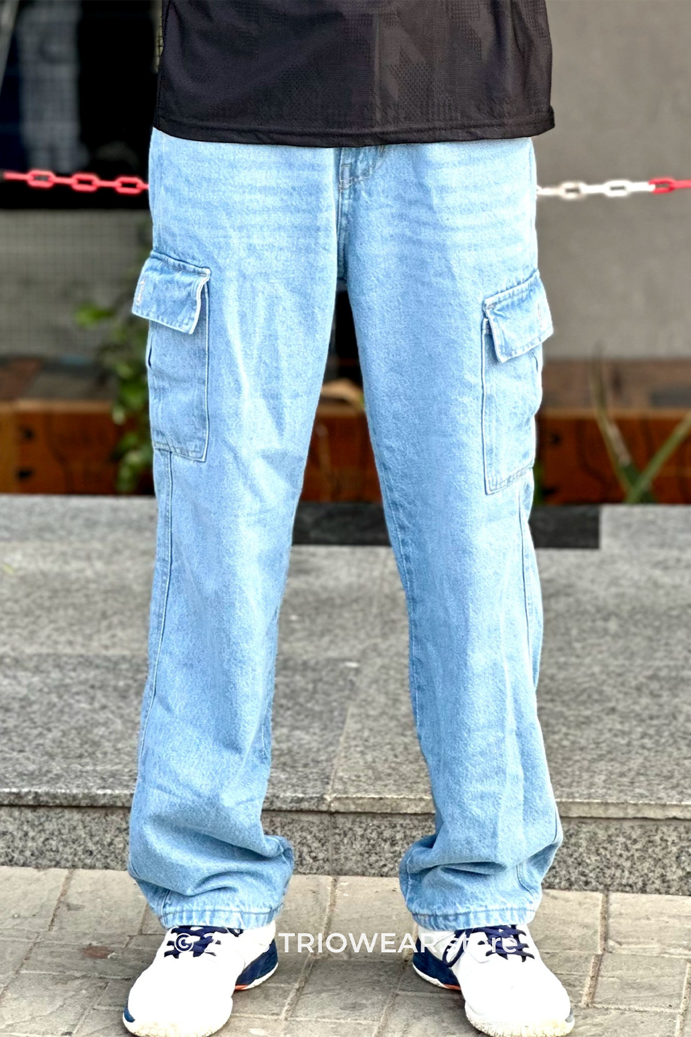 Freshen up your look with the Light Blue Baggy Cargo Jeans. Featuring an oversized relaxed fit and stylish side pockets, these jeans combine comfort with streetwear edge. The light blue wash makes them easy to pair with any tee or hoodie, giving you a versatile casual outfit.